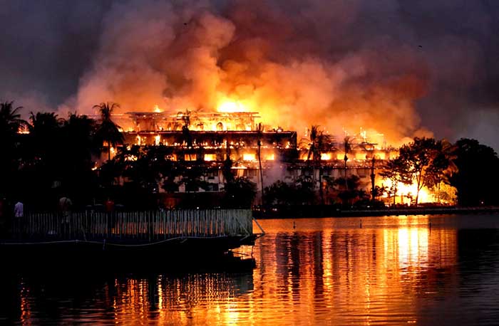 火光熊 10月19日,缅甸仰光的皇家湖皇宫酒店燃起熊熊大火。