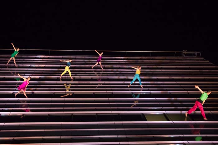 舞翩跹 10月20日,在匈牙利首都布达佩斯一栋办公楼的玻璃外墙上,美国BANDALOOP舞蹈团在CAFe布达佩斯当代艺术节上表演垂直舞蹈。舞蹈团演员“飞檐走壁”的绝技令现场观众叹为观止。 新华社发(弗尔季·奥蒂洛 摄)