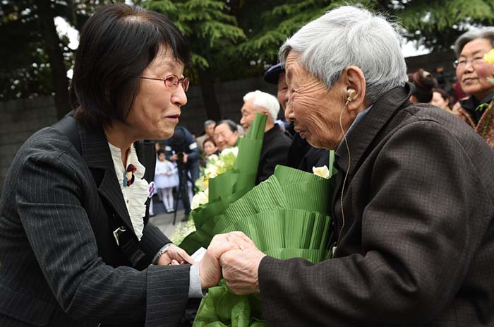 2016年4月4日,南京大屠杀历史学者松冈环(左)在南京参加祭奠活动时与南京大屠杀幸存者杨翠英交流。 新华社记者韩瑜庆 摄