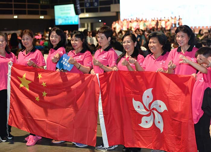 8月25日,全港妇女守护家园大集会与会者与国旗和香港特区区旗合影。 新华社记者刘大伟 摄