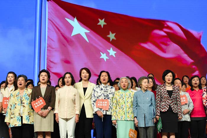 8月25日,与会者在全港妇女守护家园大集会上齐唱国歌。 新华社记者刘大伟 摄