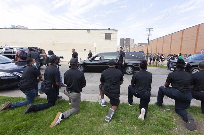 灵车驶过 6月4日,在美国明尼苏达州明尼阿波利斯市,载有乔治·弗洛伊德灵柩的灵车从单膝跪地的消防员和应急响应人员面前驶过。