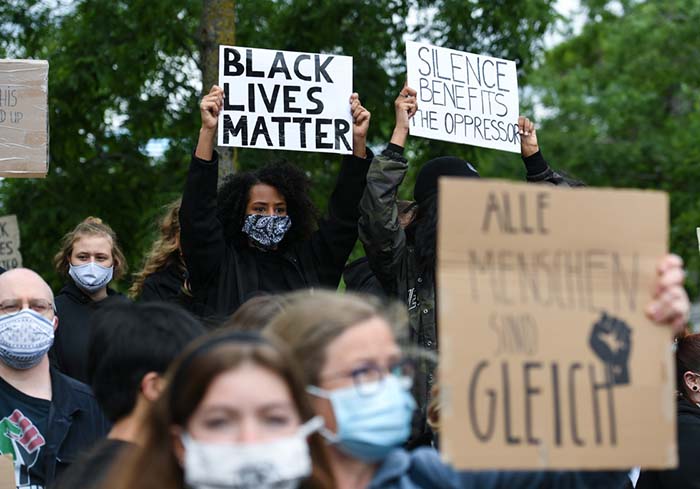 当日,德国法兰克福民众举行集会和游行示威,抗议美国明尼阿波利斯市警察暴力执法致非裔男子乔治·弗洛伊德死亡。 新华社记者逯阳 摄