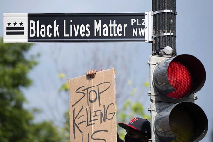 “黑人的命也是命广场” 6月6日,一名男子手举“停止杀害我们”的标语在美国华盛顿白宫附近的“黑人的命也是命广场”路牌下参加游行活动。在华盛顿市长缪里尔·鲍泽的命令下,16街位于白宫前的路段已被命名为“黑人的命也是命广场”。