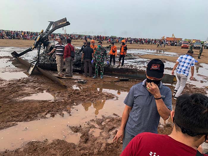 直升机坠毁 6月6日,在印度尼西亚中爪哇省肯德尔,救援人员查看直升机残骸。