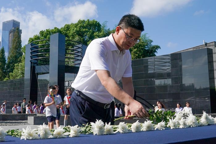 9月18日,在侵华日军南京大屠杀遇难同胞纪念馆,社会各界代表排队献花。 新华社记者李博 摄