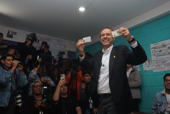 10月19日,在玻利维亚拉巴斯,玻利维亚右翼“自由”联盟候选人、前总统豪尔赫·基罗加在一处投票点展示手中投票证件。新华社发(哈维尔·马马尼摄)