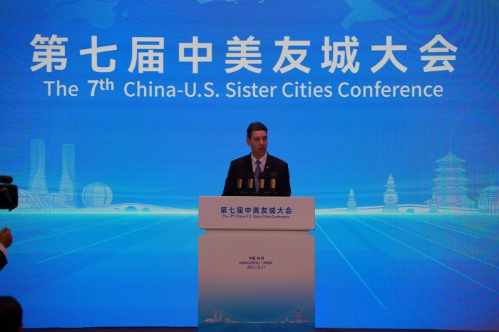 10月27日,以“更紧密的合作 可持续的未来”为主题的第七届中美友城大会在浙江杭州开幕,俄勒冈州参议长罗布·瓦格纳致辞 。(张巍摄)