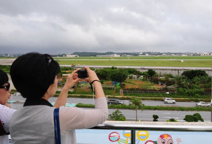 2010年5月18日,一名女子在日本冲绳县嘉手纳町的一个观景台远观美空军驻冲绳嘉手纳基地。新华社记者季春鹏 摄