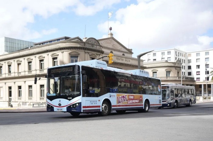 1月4日,在乌拉圭首都蒙得维的亚,一辆中国新能源旅游巴士(前)在路上行驶。新华社发(尼古拉斯·塞拉亚摄)