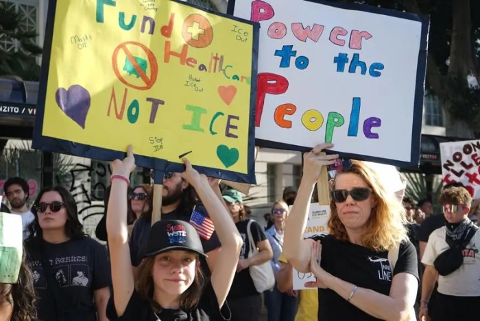 1月31日,人们在美国加利福尼亚州洛杉矶市政厅前手举标语参加示威活动。新华社发(曾慧摄)