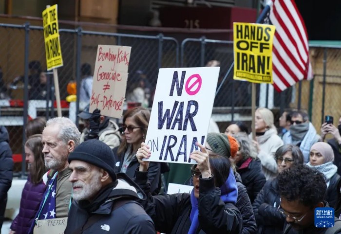2月28日,民众在美国纽约举行集会游行,抗议美国和以色列军事打击伊朗。(新华社)
