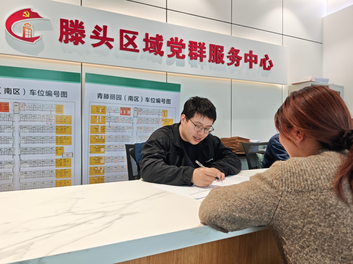 2月5日,傅一诺(左一)在滕头区域党群服务中心接待村民,提醒村民未来社区安置房装修等注意事项(受访者供图)