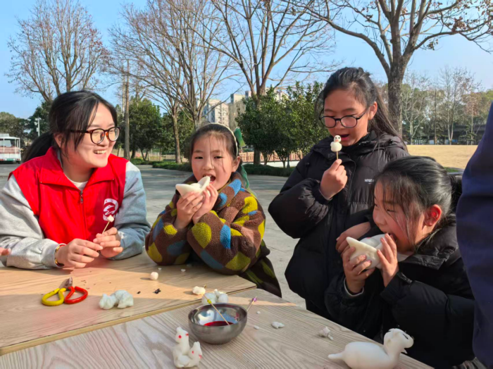 2月3日,傅丹丹(左一)在滕头村花样年糕制作体验活动中担任志愿者(受访者供图)
