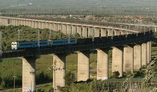 在大秦铁路沙城特大桥上行驶的万吨运煤列车(摄于2005年9月7日)。9月8日,供应全国六大电网、十大钢铁公司和26个省、自治区、直辖市煤炭需求的大秦线的扩能改造工程全面竣工,运输能力由原设计能力1亿吨跃升至2亿吨,相当于再建了一条“新”的大秦线。大秦线西起山西大同,东至河北秦皇岛,全长653公里,是我国第一条双线电气化开行重载单元列车的煤运专线。这是一条流动的黑色动脉,是“三西”(山西、陕西和内蒙古西部等煤炭主产区)地区,尤其是晋煤外运的主通道,煤炭运量占到全国铁路煤运总量的近七分之一。 新华社记者周文广 摄