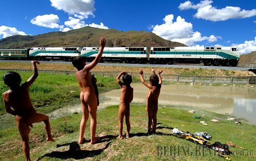 这是在西藏堆龙德庆县乡村,在铁路旁嬉戏的藏娃向行驶的火车挥手(2006年7月21日摄)。