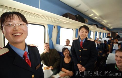 2008年11月23日,乘务员用汉、藏、英三种语言表演节目。k917次列车是从兰州开往拉萨的青藏铁路列车。在列车运行期间,该车乘务组不仅为国内外旅客准备了丰富多彩的文艺节目及活动,还向旅客提供青藏线沿途各著名景点的汉、藏、英三语介绍,受到旅客们的欢迎。 新华社记者嘎玛 摄