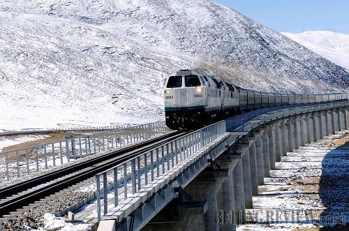 2006年10月25日,一列火车从藏北当雄县境内驶向内地。藏北高原连日降雪,穿越其间的青藏铁路成为真正的雪域天路。 新华社记者觉果 摄