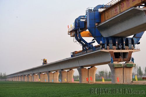 4月8日,承担京沪高速铁路土建工程二标段施工任务的中铁一局集团,在德禹大桥、禹济大桥和黄河大桥架梁施工中,再创日架整孔箱梁20孔新高,一举刷新了由他们自己日前创造的日架整孔箱梁16孔的高产成绩。截止到4月8日,中铁一局集团已顺利完成京沪高速铁路整孔箱梁架设473孔,为京沪铁路早日通车奠定了坚实的基础。 新华社记者何俊昌 摄