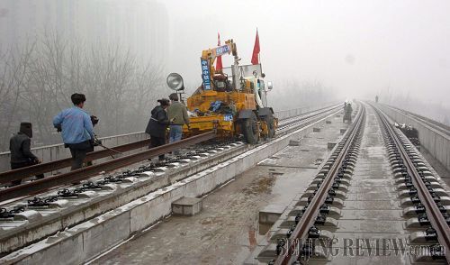 2007年12月10日,中铁二局的施工人员在铺轨。当日,京津城际快速铁路双线铺轨至北京南站,全线贯通指日可待。京津城际快速铁路自2007年11月13日从天津杨村开始铺轨以来,经过努力,分别取得单线日铺轨9公里、双线日铺轨14公里的成绩。