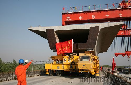 2009年4月18日,京沪高速铁路广阳制梁场附近,中国铁建十七局集团的巨型运梁车正将一片重达900吨的箱梁运往前方架梁作业现场。京沪高速铁路自2008年4月18日开工建设一周年之际,铁路建设首战告捷,攻坚之战全面展开,形势十分喜人。 新华社发(刘渝摄)