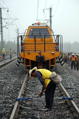 2009年5月14日清晨,中铁二局大秦线项目施工人员在天津蓟县西站测量改造后的轨距。当天,大秦(大同-秦皇岛)铁路4亿吨扩能改造工程蓟县西站全面完工,首“站”告捷,成为扩能工程中第一个开通的车站。