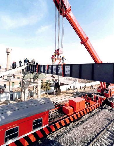 2002年12月5日,中铁工程总公司四局四公司员工正在京秦铁路玉田车站架设人行过街天桥。北京至秦皇岛全长299公里的客运通道提速改造工程是中国第一条运营线一次提速达每小时200公里的大型提速改造工程,计划于12月底前完成。改造完成后的京秦线列车运行时速将达到160至200公里,成为中国华北连接东北地区的第一条快速客运通道,将促进沿线经济和旅游的发展。 李晓明摄(新华社稿)