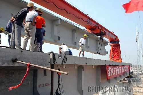 2002年8月2日,陇海铁路新建的西安灞河桥进入最后的架梁铺轨阶段,原定9月1日通车的计划可望提前。旧灞河桥于2002年6月9日被洪水冲垮,大批列车改由邻近的西康铁路灞河桥绕行,通行能力受到一定影响。图为新建灞河大桥架梁现场。 新华社记者焦卫平 摄
