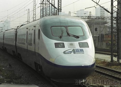 2001年1月8日,代表国内最高水平的国产新型交流电动车组“蓝箭”号在广深线正式投入商务运营。“蓝箭”号车厢外形呈流线型,列车信息系统由微机控制,车内采用航空式装修,可容纳422名旅客。它将以200公里的时速运行,从广州至深圳只需要55分钟。 新华社记者陈学思摄(传真照片)