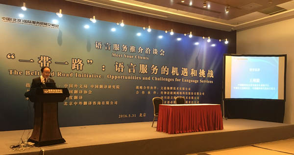 “通过举办语言服务推介会,共同探讨中国企业‘走出去’过程中的语言服务战略和‘互联网+’背景下人工智能与机器翻译的新趋势,一方面为‘走出去’提供语言服务策略咨询,另一方面搭建交流互动平台,促进供需对接和贸易匹配的实现”,中国翻译协会常务副会长兼秘书长、中国外文局副局长、中国翻译研究院执行院长王刚毅在致辞中讲到。