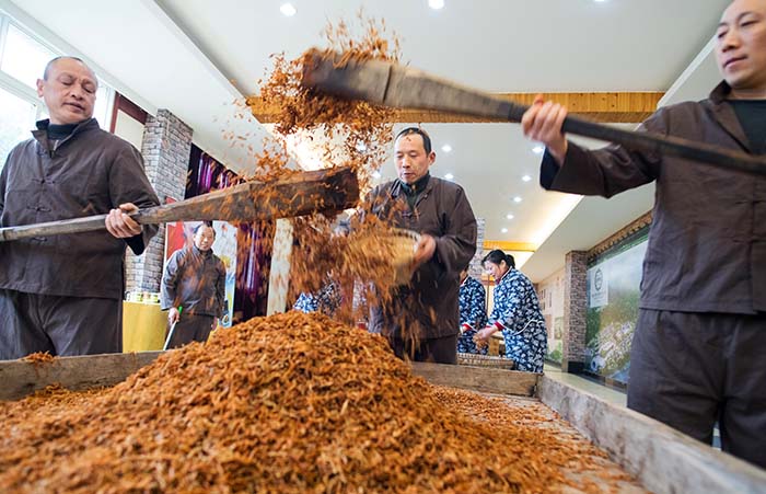 2月9日,重庆涪陵榨菜国家级非物质文化遗产传统工艺制作工作室内,李文林(中)和他的助手们按照传统工艺对榨菜丝进行拌料作业。 新华社记者刘潺 摄