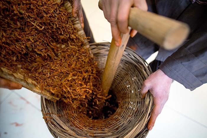 2月9日,重庆涪陵榨菜国家级非物质文化遗产传统工艺制作工作室内,李文林(右)和助手按照传统工艺使用传统器具进行榨菜装坛。 新华社记者刘潺 摄