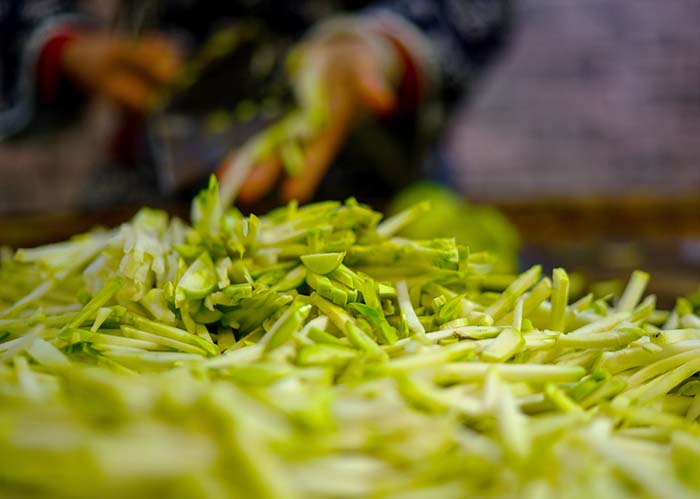 2月9日,重庆涪陵榨菜国家级非物质文化遗产传统工艺制作工作室内,当地的妇女在按照传统工艺要求对选出的青菜头进行切丝。 新华社记者刘潺 摄