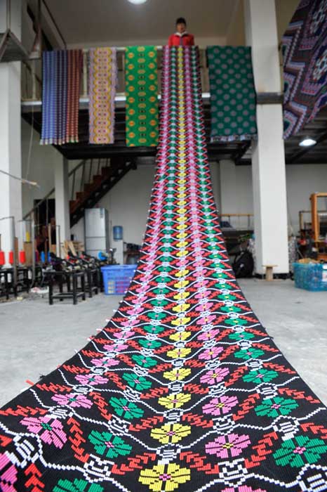 4月9日,在湖北恩施旗峰坝“西兰卡普”生产车间,技师在展示十米长的“西兰卡普”作品。