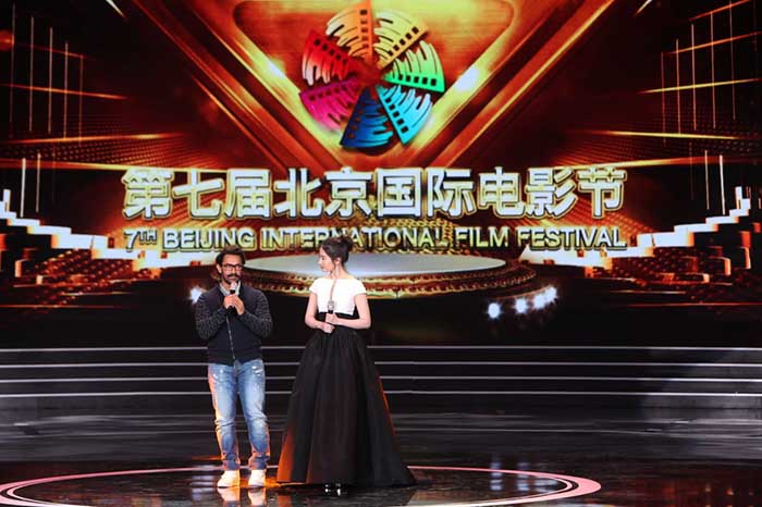 4月16日,嘉宾阿米尔·汗(左)与刘亦菲在开幕典礼上推荐入围影片。 新华社记者郑焕松 摄