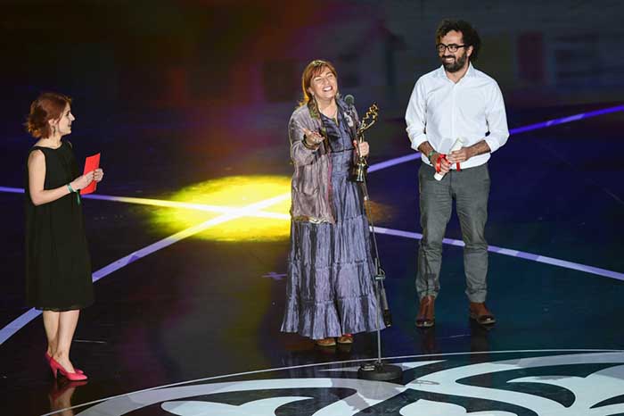 4月23日,获得“天坛奖最佳影片奖”的影片《卢卡》主创团队发表获奖感言。 新华社记者马宁 摄