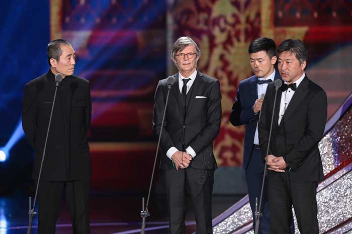 4月23日,颁奖嘉宾张艺谋(左一)、比利·奥古斯特(左二)、是枝裕和(右一)为“天坛奖最佳影片奖”开奖。 新华社记者侯东涛 摄