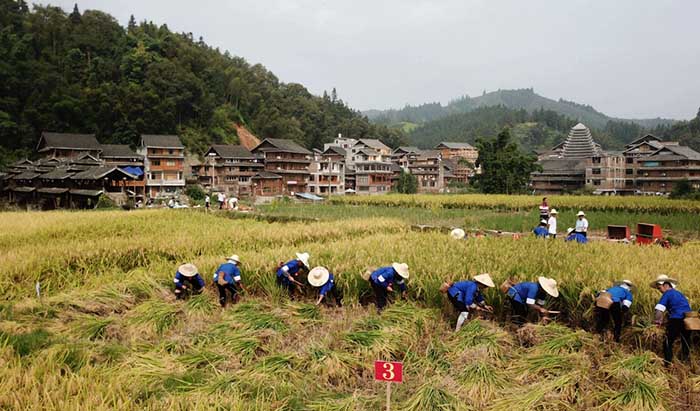 当日,广西三江侗族自治县举办巾帼能手抓鱼收稻擂台赛,100余名侗乡妇女在稻田内分组竞赛抓鱼、速打谷子,庆祝丰收。 新华社发(龚普康 摄)