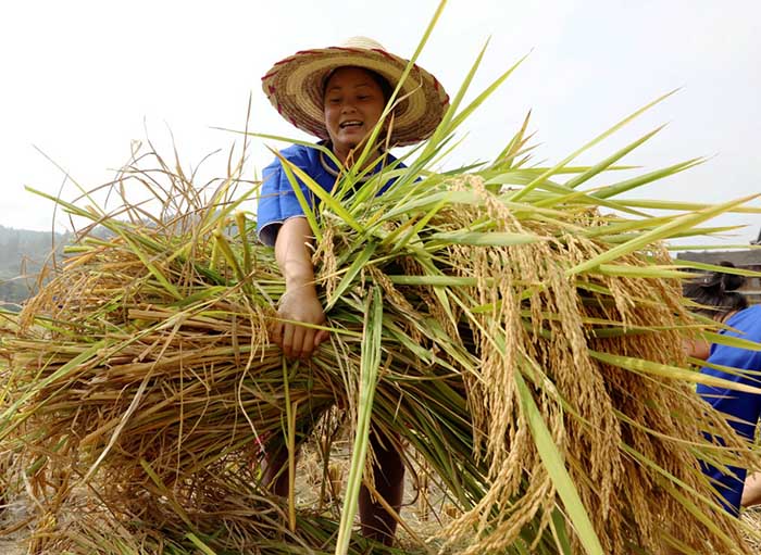 10月9日,参赛侗族妇女在广西三江林溪镇平岩村田间收割稻谷。 新华社发(吴练勋 摄)