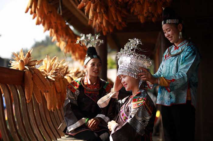 10月30日,贵州省黔东南苗族侗族自治州丹寨县扬武镇排莫村,苗族女孩子在节日中妆扮。 新华社发(黄晓海 摄)