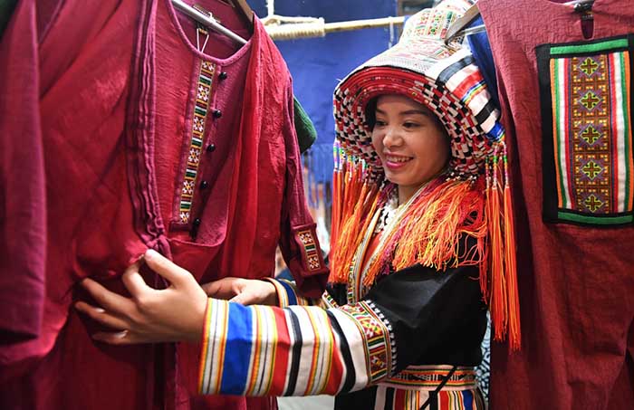 12月5日,在广西贺州市八步区一家瑶族服饰刺绣艺术馆,一名女子在整理瑶族服装。 新华社记者陆波岸 摄