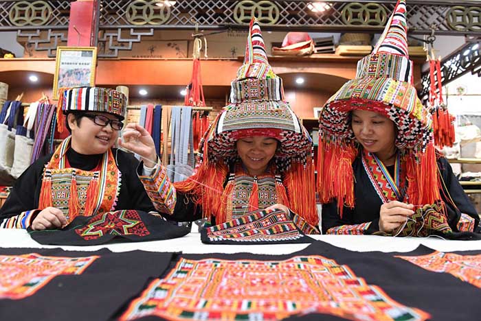 12月5日,在广西贺州市八步区一家瑶族服饰刺绣艺术馆,三名绣娘在加工瑶族服饰产品。 新华社记者陆波岸 摄