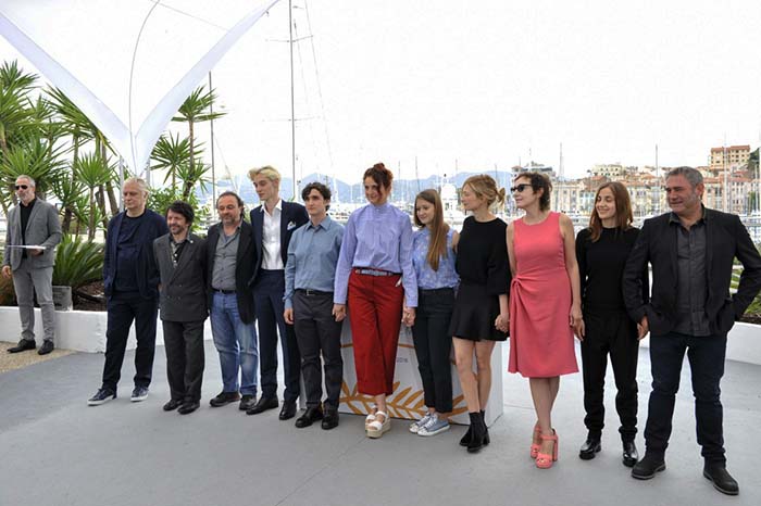 5月14日,在法国戛纳,主竞赛单元影片《幸福的拉扎罗》的导演阿莉切·罗尔瓦赫尔(右六)等主创人员亮相拍照式。