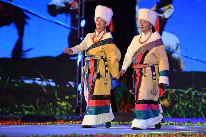 8月20日,在肃北蒙古族自治县文化体育广场,青海省河南蒙古族自治县服饰队登台亮相。 新华社记者范培珅 摄