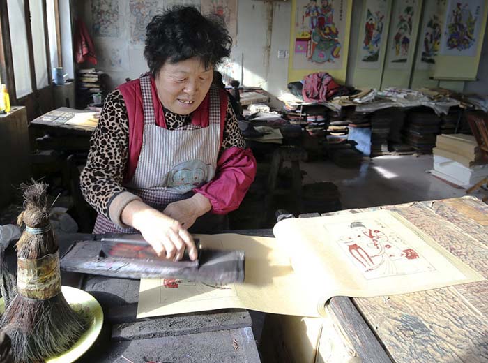 1月8日,杨家埠村年画艺人在印制木版年画。 新华社发(张驰 摄)
