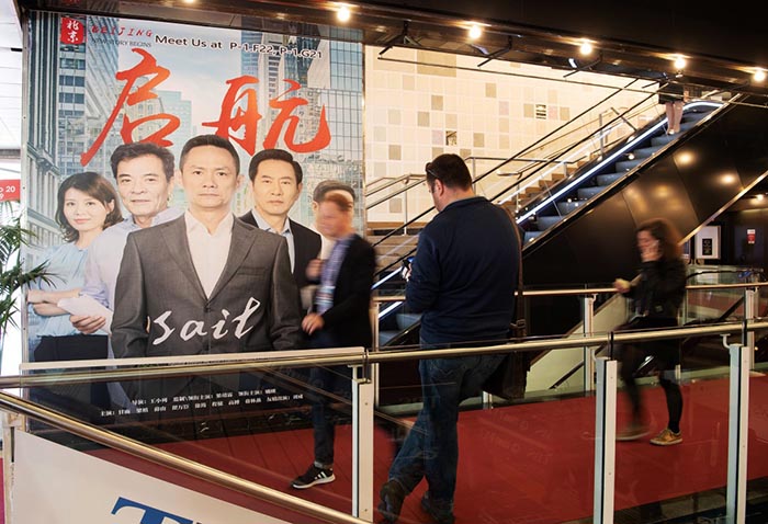 4月8日,在法国戛纳春季电视节上,人们走过一部中国电视剧的海报。 新华社发(杰克·陈 摄)