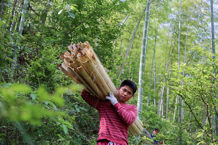 5月22日,在隆回县滩头镇桃林村,李秋桂将劈成两指宽的“白料”扛向作坊。 新华社发(曾勇 摄)