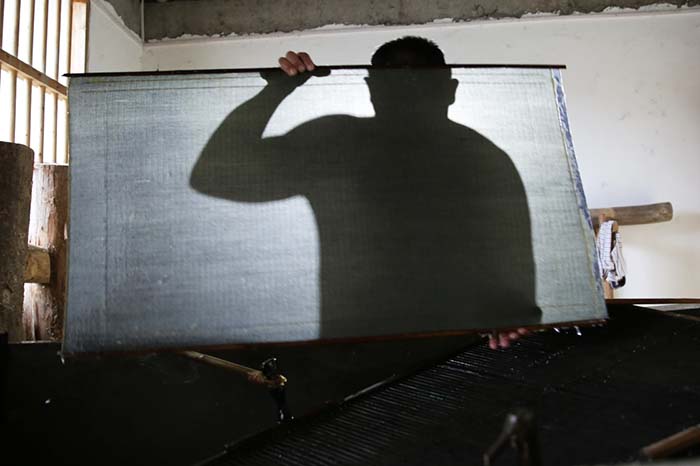 6月25日,在隆回县滩头镇烟冲古纸作坊,李志军进行手工抄纸。 新华社发(曾勇 摄)
