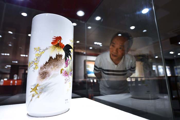 毛光辉在景德镇市传统粉彩研究院的陈列馆内观察自己的作品(8月2日摄)。 新华社记者胡晨欢 摄