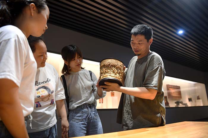 8月28日,洪建华(右一)在自己创办的徽派雕刻博物馆内向游客介绍雕刻作品。 新华社记者刘军喜 摄